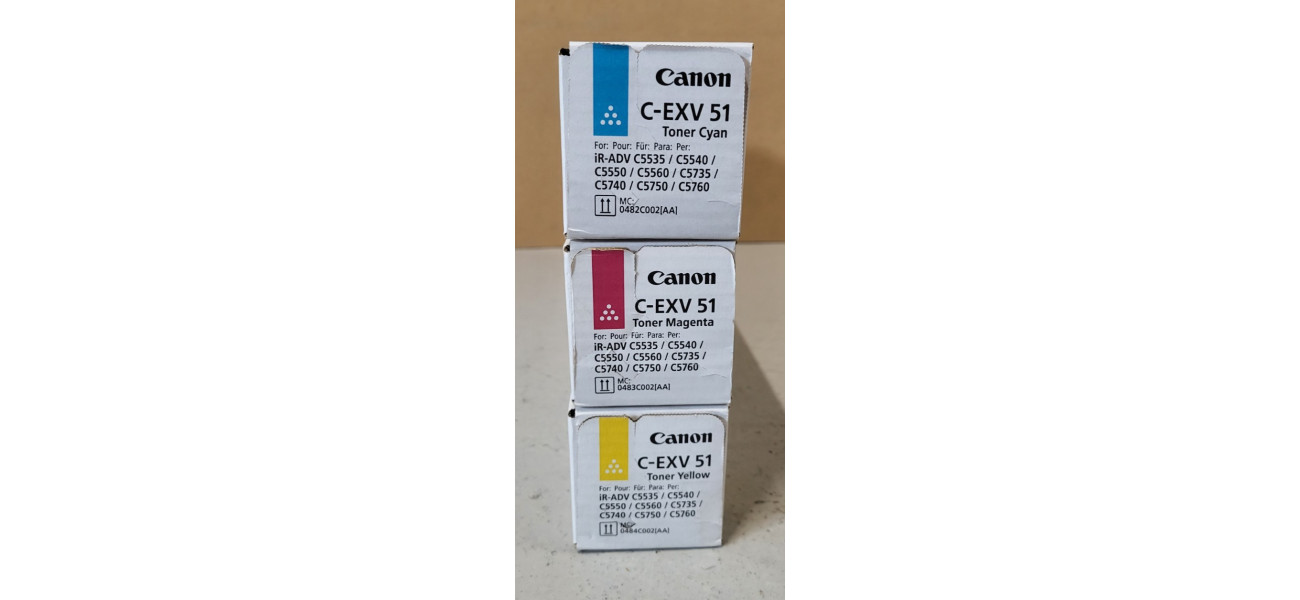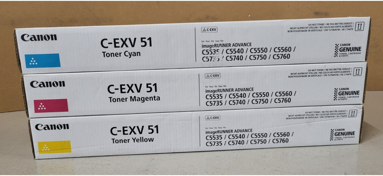 Sie bieten hier auf einen Satz, bestehend aus 3 Original Toner C-EXV 51 für folgende Modelle: Canon imageRUNNER ADVANCE C5535, C5540, C5550, C5560, C5735, C5740, C5750, C5760