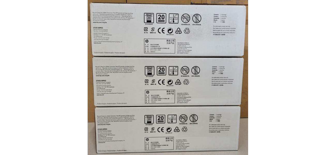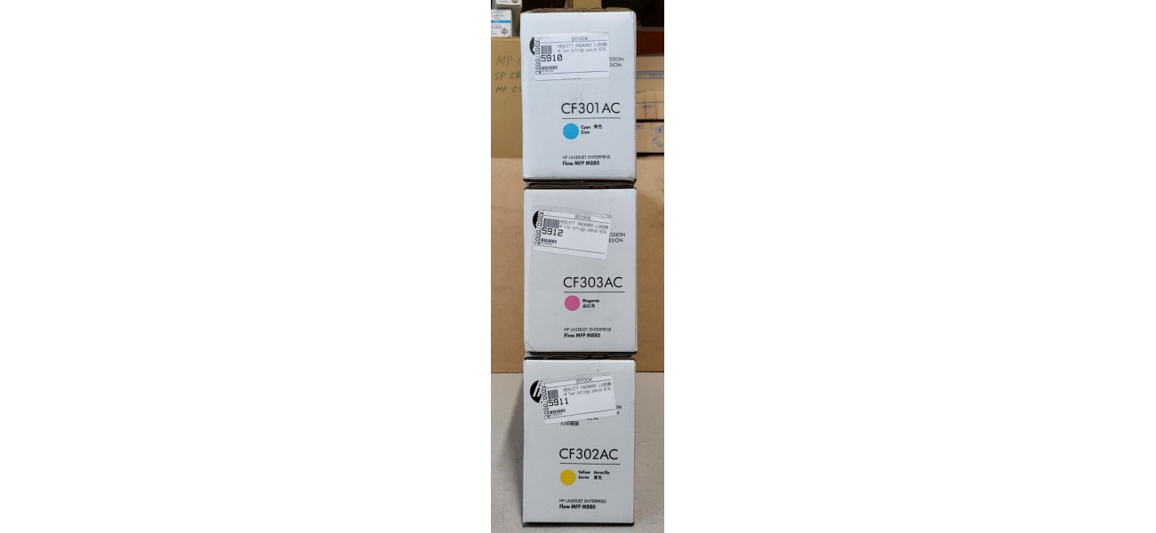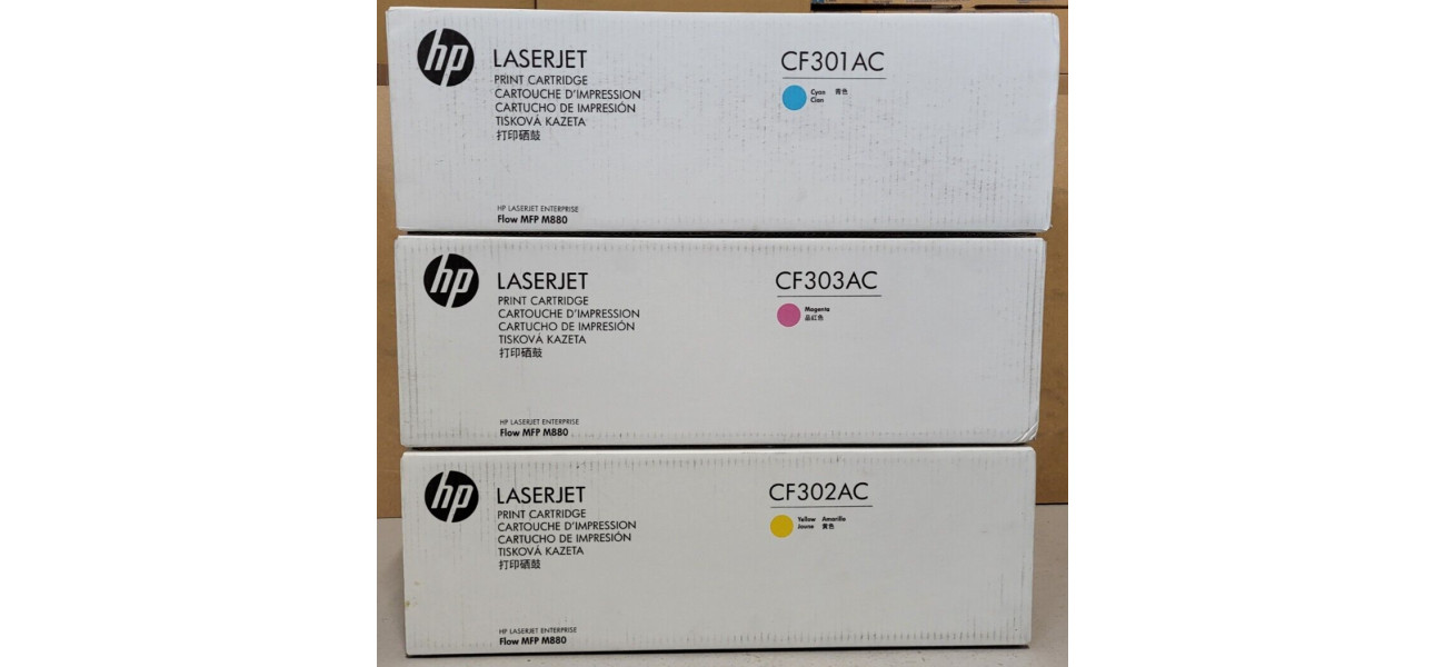 Sie bieten hier auf einen Satz, bestehend aus 3 Original Toner HP für folgende Modelle: HP LaserJet Enterprise Flow MFP M880 1x Toner HP CF301AC Cyan, EAN: 887758726464 1x Toner HP CF302AC Yellow, EAN: 887758726440 1x Toner HP CF303AC Magenta, EAN: 887758726457 Die Toner sind neu und originalverpackt.  Die Originalverpackungen sind nicht geöffnet und befinden sich in einem perfekten Zustand, A-Ware. (siehe Originalfotos) Der Versand innerhalb Deutschlands ist kostenlos. Der Käufer bekommt eine Rechnung mit ausgewiesener Mehrwertsteuer. Bei Fragen kontaktieren Sie mich gerne telefonisch oder per Mail! (s. rechtlichen Informationen des Verkäufers)