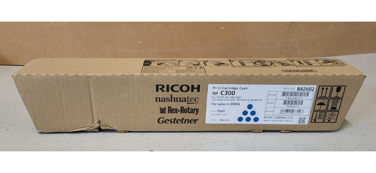 Sie bieten hier auf einen Original Ricoh Toner IM C300 der Farbe Cyan für die Modelle: Ricoh IM C300, IM C300F / IM C4001x Toner Ricoh IM C300 Cyan (842602) / 4.500 Seiten Der Toner ist neu und originalverpackt. Die Originalverpackung ist nicht geöffnet aber weist einige optische Mängel auf. (siehe Originalfotos) Der Versand innerhalb Deutschlands ist kostenlos! Der Käufer bekommt eine Rechnung mit ausgewiesener Mehrwertsteuer.Bei Fragen kontaktieren Sie mich gerne telefonisch oder per Mail! (s. rechtlichen Informationen des Verkäufers)